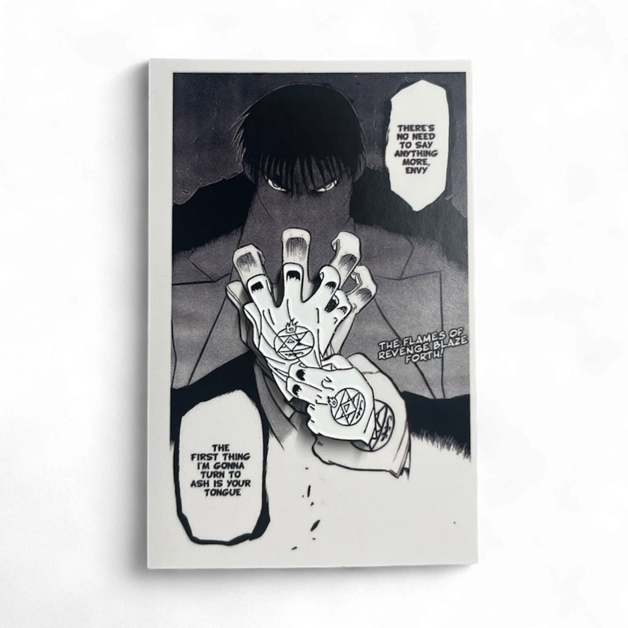 Roy Mustang Flame Alchemist gloves enamel pin from Fullmetal Alchemist.