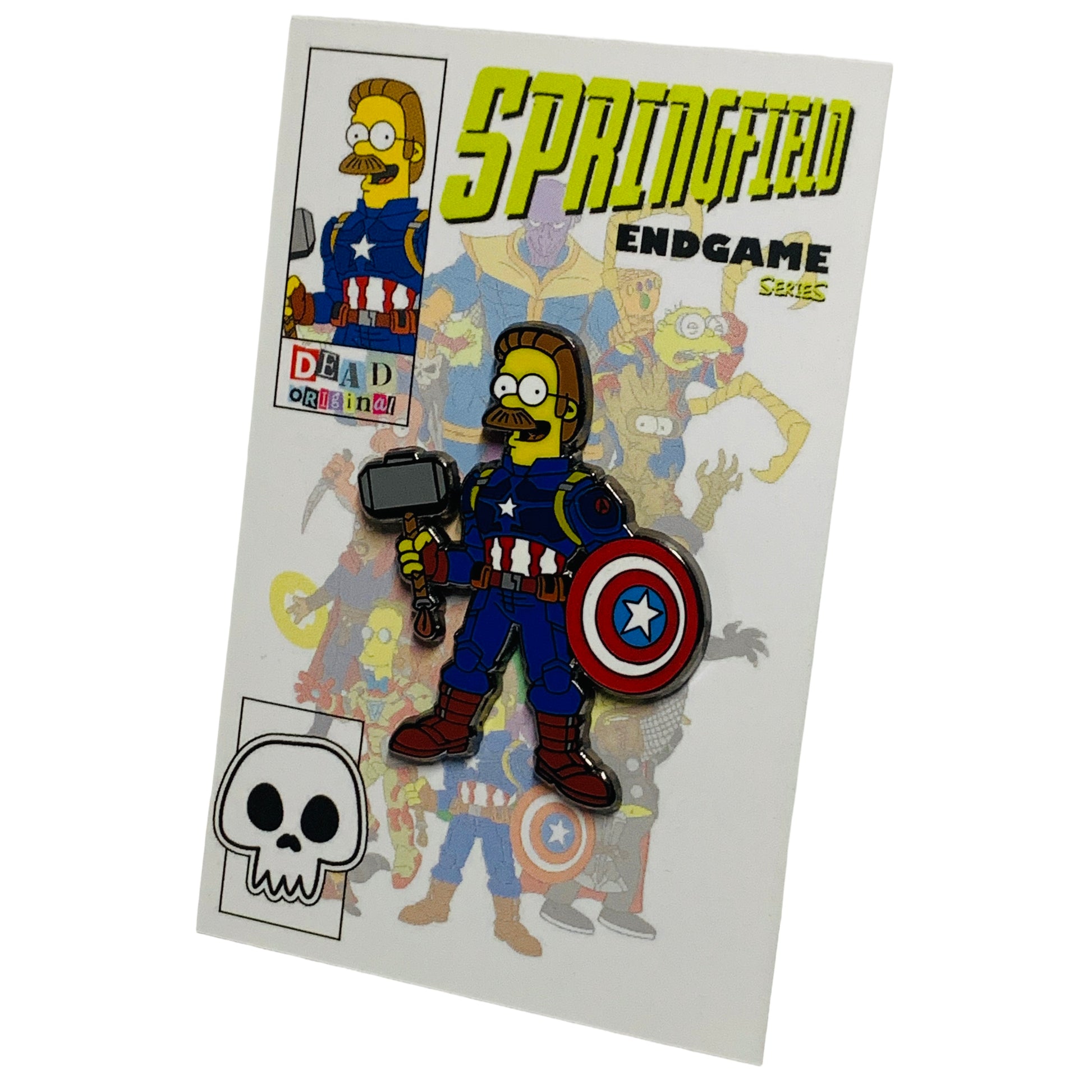 From the creative one man powerhouse that is Dead Original, the Springfield Endgame series unites the worlds of The Simpsons and Marvel in a hilarious crossover and this Ned Flanders as Captain America enamel pin might just be the most righteous of them all.